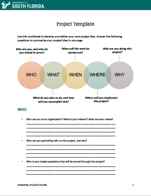 Clarify your project idea with this worksheet, covering key questions like "Who, What, When, Where, Why" and outlining purpose, population, resources and timeline for effective planning.
